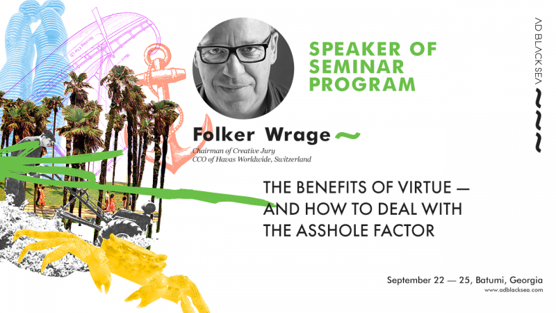 FolkerWrage, Председатель жюри креативного состава, CCOв HavasWorldwide, Швейцария, выступит с темой “Thebenefitsofvirtue– andhowtodealwiththeassholefactor” на семинарской программе международного фестиваля рекламы AdBlackSea, который пройдет 22-25 сентября в Батуми.