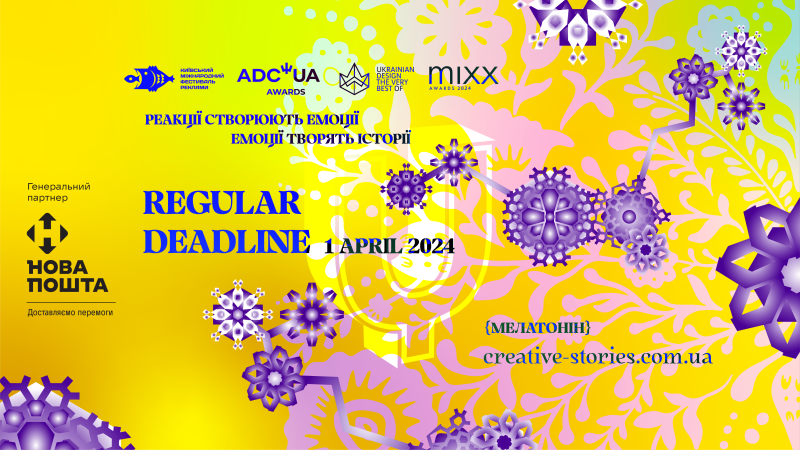 До 1 квітня включно триває прийом робіт на умовах Regular Deadline на 4 рекламні фестивалі креативності України: Київський Міжнародний Фестиваль Реклами, ADC*UA Awards, Ukrainian Design: The Very Best Of та MIXX Awards Ukraine.