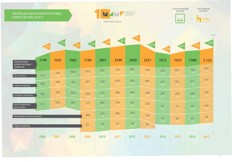 Судите сами. 2016 год стал переломным. Рынок показал рост на целых 13%. Частично цифра объясняется инфляцией, но и объективно активность рекламодателей стала намного выше: больше тендеров, больше реализованных программ, чем в предыдущие два года.