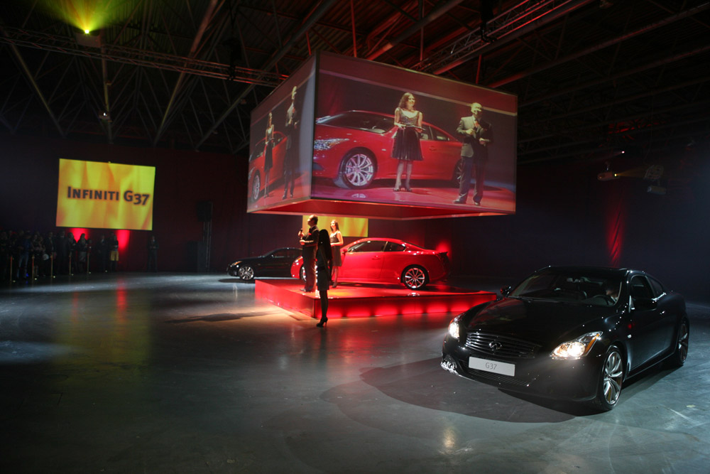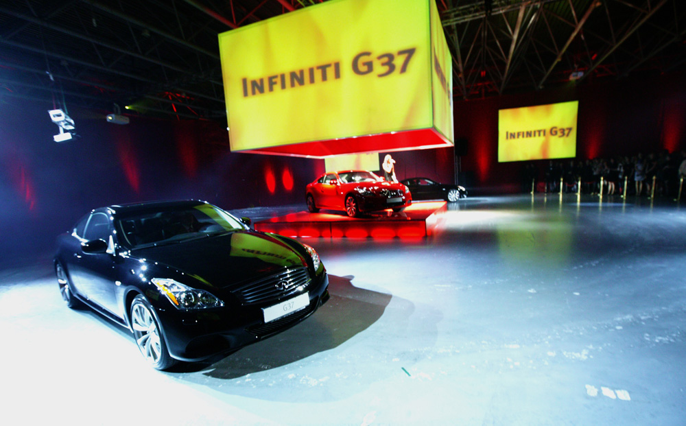 Первое знакомство с Infiniti G37 состоялось на больших экранах, расположенных по всему периметру зала. В центре зала находился огромный куб, магнетически притягивавший к себе внимание гостей. Факиры и танцоры представили невероятно динамичное шоу с фонтанами огня, создавая интригу перед кульминацией презентации. Все внимание было сосредоточено на экранах, демонстрировавших стремительно несущийся в зал автомобиль. Как в захватывающем экшн-фильме, раздался рев моторов и, разбив стекла экранов, в зал ворвались два черных Infiniti G37. Кульминацией шоу стало появление главного – огненно-красного G37, который все это время скрывался под кубом в центре зала.