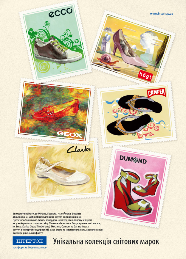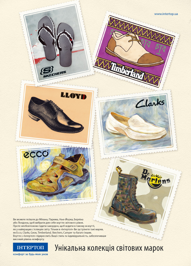 «Если вы предпочитаете покупать и носить обувь самых известных мировых брендов, для этого не обязательно ехать за границу или искать ее в разных магазинах. Это можно сделать в ближайшем магазине сети «Интертоп» - такое сообщение доносят принты потребителю. Слово «бренд» заменено более родным по этимологии – «марка», марки и являются главными героями коммуникации. Они выглядят как настоящие, из коллекции филателиста, – выполненные в разных художественных стилях, соответствующих восприятию обуви, изображенной на них.