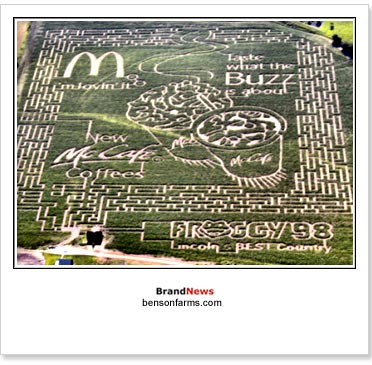 Именно в лабиринте McDonald’s разместил свою рекламу кофеен McCafe, которые сейчас проходят тестирование в некоторых штатах США – вернее, сам лабиринт образован проложенными в кукурузе контурами логотипов и стаканчиков McCafe.