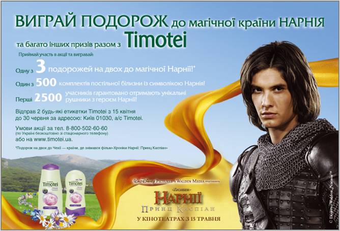 29 августа BTL-агентство SKAZKA подвело итоги акции от TM Timotei, в ходе которой были разыграны три путешествия в Чехию по местам съёмок сиквела «Хроники Нарнии. Принц Каспиан». Акция проходила по всей Украине с апреля по август 2008 года.