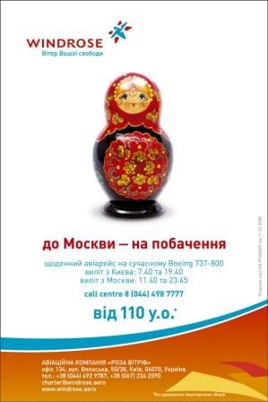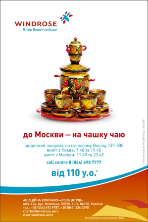 В октябре стартовала рекламная кампания «Розы Ветров» - молодого игрока на рынке авиаперевозок Украины. В кампании задействованы: пресса, интернет, наружная реклама и радио. Креатив обеспечивает агентство Kaffeine Communications.