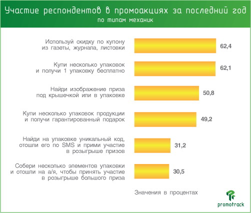 В ходе исследования были выявлены результаты, которые полностью меняют представление об эффективности промо-кампаний. Например, 95% респондентов отметили, что они лично либо члены их семей брали участие в промо-акциях на протяжении последнего года. Наиболее активно в промо-акциях участвовали женщины, а также потребители со средним уровнем дохода. В свою очередь наиболее популярными промо-механиками среди киевлян оказались разнообразные купоны со скидками, а также «купи и получи бесплатно 1 упаковку продукции».