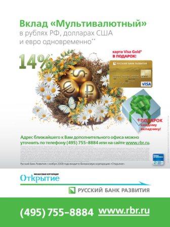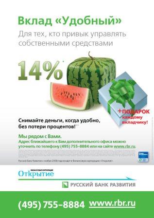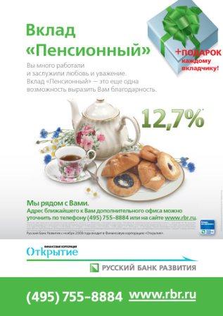 В рамках новой стратегии развития розничного бизнеса в Русском Банке Развития были представлены четыре новых вклада для частных клиентов: «Мультивалютный», «Удобный», «Проще простого» и «Пенсионный». Специально для продвижения новой линейки была разработана серия рекламных материалов.