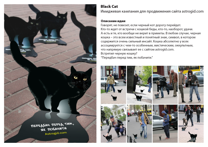 Напомним, что 24 апреля 2009 года киевских прохожих шокировали черные коты, в разгар утреннего часа пик разместившиеся на тротуарах города. Только подойдя вплотную к животному, можно было заметить, что это не настоящий кот, а оригинальная наклейка. В течение дня к флешмоберам присоединились представители украинского шоу-бизнеса – «фабрикантка» Аня Мухина, певец Влад Цветаев, MC Тамерлан и участники группы Chicos De La Fiesta.