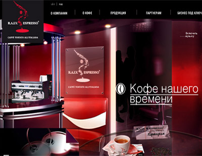 Стилистика  сайта -http://www.raivespresso.com/- выполнена в духе элитного кофейного клуба, интерьер которого завлекает насыщенностью главных корпоративных цветов компании  – красного и черного и виртуальным ароматом свежесваренного кофе.