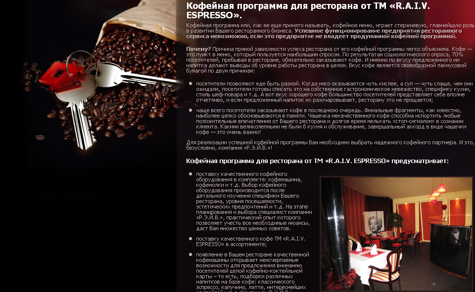 Компания R.A.I.V с 1997 осуществляет продажу кофе в сегменте HoReCa и занимает сегодня лидирующие позиции на рынке Украины и Молдавии, активно покоряет рынок Казахстана, России и Белоруссии.  Задачей сайта является представление информации о компании, ее деятельности и услугах потенциальным партнерам, клиентам и потребителям кофе ТМ R.А.I.V.