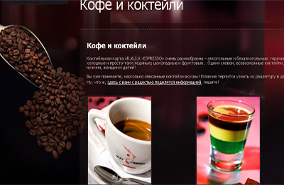 «Предложенная концепция сайта сразу нам понравилась, а дизайн мы утвердили  с первого эскиза. Сайт стильный, по нему удобно передвигаться и, не смотря на достаточно большое количество функциональных элементов на первой странице, он не смотрится перегруженным. Ко всему прочему, я уверена, что сайт  доставить такое же эстетическое удовольствие посетителям, как и чашечка нашего «R.A.I.V ESPRESSO» .
