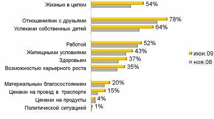 Если в ноябре 2008 года средний уровень удовлетворенности составлял 5.0 по 7-балльной шкале, в июне этого года показатель вырос до 5.5. Структура удовлетворенности основными аспектами жизни осталась без изменений: по-прежнему наиболее удовлетворены украинцы отношениями с друзьями и успехами детей. В меньшей мере это относится к работе, жилищным условиям, здоровью, карьерным возможностям. При этом практически по всем показателям отмечается небольшой рост: это свидетельствует о психологической адаптации к сложившейся ситуации и большей готовностью довольствоваться тем, что уже есть.
