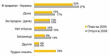 Так, треть опрошенных (32%) планирует во время отпуска совершить поездку в пределах Украины, что лишь на 5% меньше, чем в прошлом году. Количество желающих провести отпуск дома или за городом, на даче (15% и 13% соответственно) осталось без изменений по сравнению с прошлым годом.