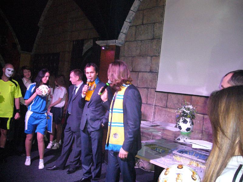 Ведущие вечеринки – Два Товарища Глеб Тимошенко и Игорь Диденко пригласили к участию в качестве защитников, полузащитников, форвардов, болельщиков, арбитров всех приглашенных на вечер.