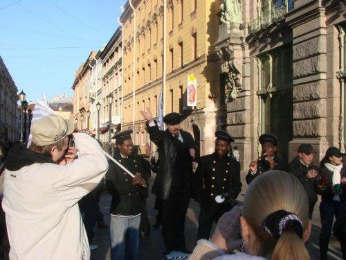 «Бравые ребята в форме революционеров размахивали флагами и гудели в гудки. Боевая девочка-революционерка, сопровождающая предводителя марша, выкрикивала в мегафон различные агитационные лозунги. По ходу движения колонна сделала несколько остановок для того, чтобы посвятить потрясенную публику в суть акции и пообщаться с народом. Во время этой паузы матросы дарили прохожим приятные сувениры - гудки, колпаки и хлопушки. На площади Восстания счастливой публике были преподнесены подарочные сертификаты от Zebra Home. Кульминацией праздничного шествия стал запуск в небо фирменного флага», - рассказал Дмитрий Ковалевский.