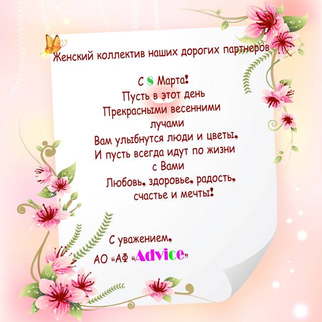 Поздравление с женским днем от адвокатской фирмы "ADVICE"