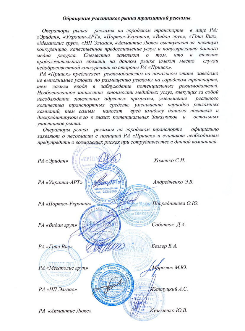 В исполнительную дирекцию Всеукраинской рекламной коалиции поступило обращение в виде открытого письма 8-ми компаний - операторов на рынке транзитной рекламы, в котором они обращают внимание рекламодателей на недобросовестную конкуренцию со стороны РА "Прииск", предлагающей рекламодателям заведомо невыполнимые условия на этапе тендеров.
