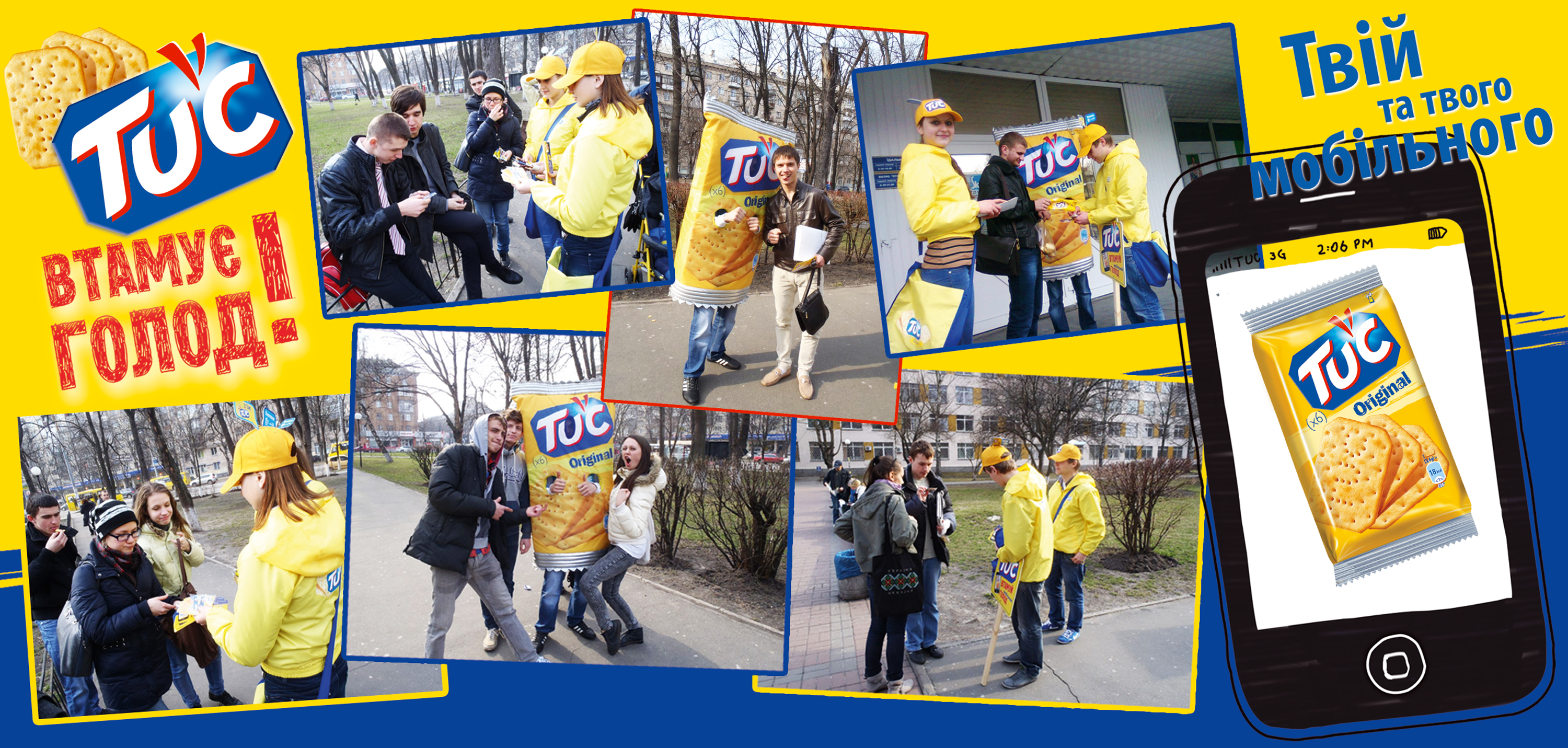 Ідея та реалізація цієї молодіжної акції для ТМ TUC належать агенції маркетингових комунікацій Euro RSCG 4D (Україна). Креативна команда відправила спеціально одягнених у «пачки» TUC промоутерів до університетів країни. Згідно з вигаданим салоганом «Втамуй голод свій та свого мобільного» кожен, хто обміняв упаковки від придбаних крекерів на виграшні скретч-картки, міг за допомогою інструкцій одразу поповнити свій мобільний рахунок на заявлену суму.