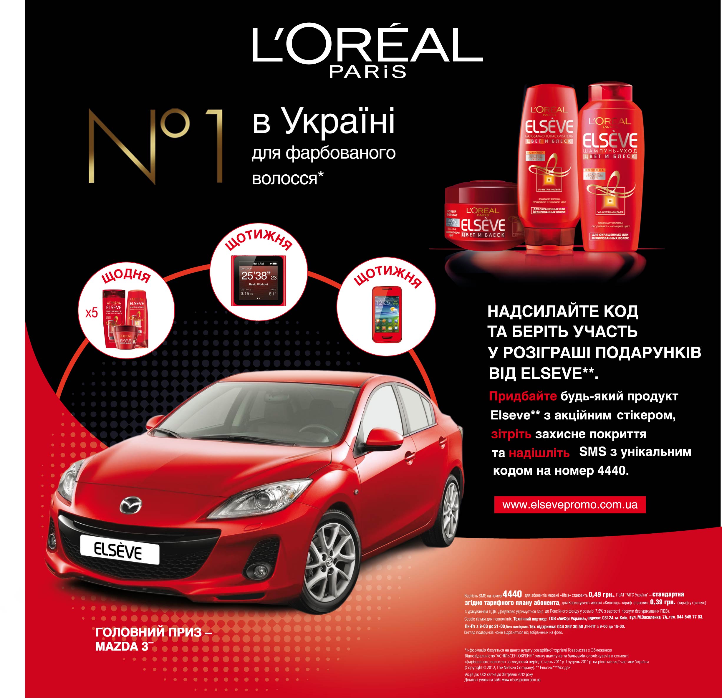 Инициатором этой акции стала компания L’Oreal. Воплощало – агентство маркетинговых коммуникаций Euro RSCG 4D (Украина). В рамках проекта команда агентства разработала специальный промосайт с условиями акции: http://elsevepromo.com.ua, а также взяла на себя все организационные задачи. Согласно механике участником розыгрыша призов можно было стать после покупки любого продукта Elseve с акционным стикером. Потом нужно было стереть защитное покрытие и отправить SMS с уникальным кодом на специальный номер, остальное – дело рук вашей фортуны! Каждый день разыгрывалось пять наборов Elseve, а каждую неделю – телефон или плеер. Главный подарок – автомобиль Mazda 3. Последним можно было полюбоваться в торговых центрах Киева - Караван и DreamTown.