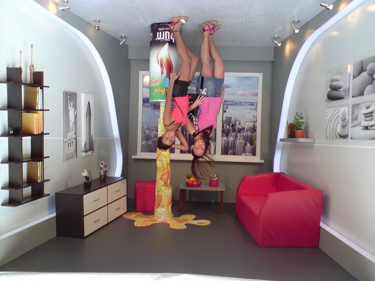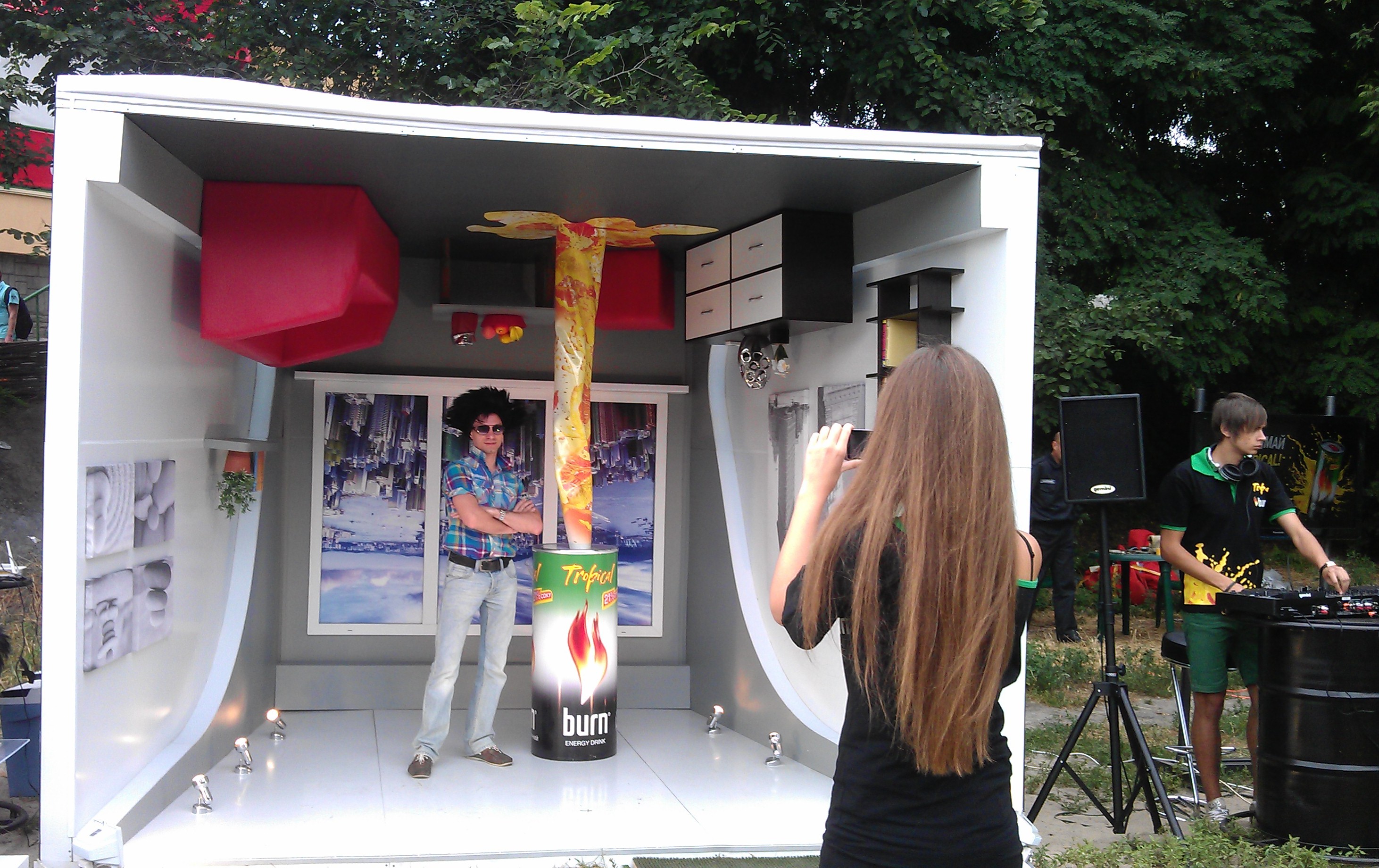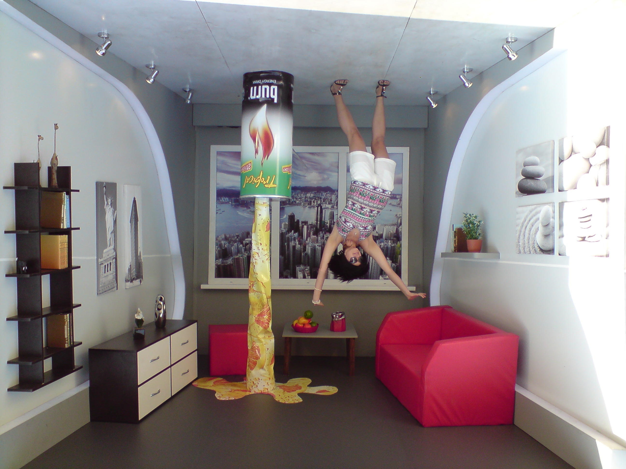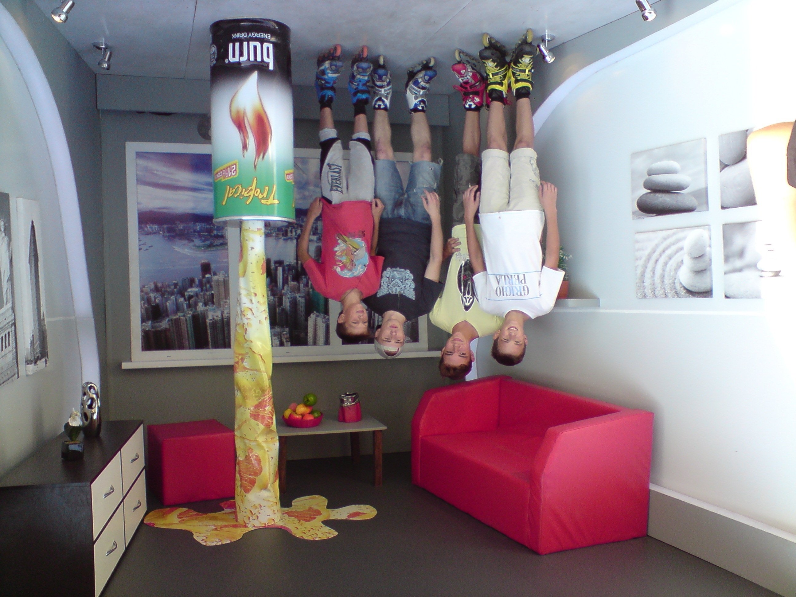 В центре комнаты установлена огромная банка «Burn Tropical» с напитком, который «выстреливает» ярким фонтаном.