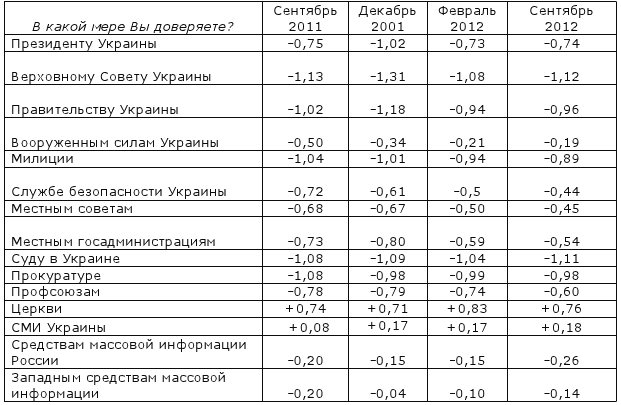 Так за период с сентября 2011 по сентябрь 2012, хотя и осталось отрицательным, но возросло доверие к вооруженным силам Украины (с -0,50 до -0,19), милиции (с -1,01 до -0,89), Службе безопасности Украины (с -0,72 до -0,44), местным советам (с -0,68 до -0,45), госадминистрациям (с -0,73 до -0,54). Доверие к Президенту Украины упало в декабре 2012 г. (-1,02), но в сентябре 2012 вновь стало почти таким же как и год назад (-0,75). По состоянию на сентябрь 2012 года, украинцы меньше всего доверяют Верховному Совету (-1,12), суду в Украине (-1,11), прокуратуре (-0,98) и правительству Украины (-0,96). Среди тех, кому доверяют, по сравнению с сентябрем прошлого года, возросло доверие к церкви с (0,74 до 0,76) и неплохо возросло доверие к украинским СМИ (с 0,08 до 0,18).