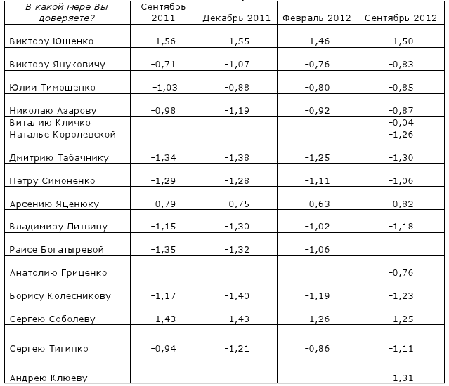 Самым лучшим доверием и популярностью сейчас пользуется Виталий Кличко (-0,04), в пользу которого сработал положительный имидж человека, который делает Украину известной в мире. Хотя его индекс отрицательный, но этот показатель очень мал, фактически на грани перехода в плюс. Если в ближайшее время не произойдет никаких негативных событий связанных с именем этого политика, то возможно он станет первым политиком с положительным индексом доверия за последние несколько лет. Единственными политиками доверие к которым ощутимо выросло за период с сентября 2011 года по сентябрь 2012 стали Петр Симоненко (с - 1,29 до -1,06) и Юлия Тимошенко (с -1,03 до -0,85), хотя опять же, их индексы доверия по-прежнему остаются отрицательными.