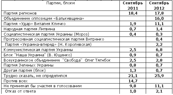 исследования. Больше всего вырос рейтинг партии «УДАР» Виталия Кличко (с 1,9% до 11,1%), а также Коммунистической партии Украины (с 2,5% до 6,8%). Рейтинг Партии регионов снизился по сравнению с сентябрем прошлого года (с 18,4% до 17,8%), однако Партия регионов все равно остается лидером. На втором месте Объединенная оппозиция (16,0%). Также, по сравнению с сентябрем прошлого года, возросло количество тех, кто не определился с выбором (с 21,1% до 25,9%), а также тех, кто вообще не хочет принимать участие в голосовании (с 9,8% до 11,1%) Ели бы в ближайшее воскресенье состоялись досрочные выборы в Верховную Раду Украины, за какую политическую партию (блок) Вы бы проголосовали?