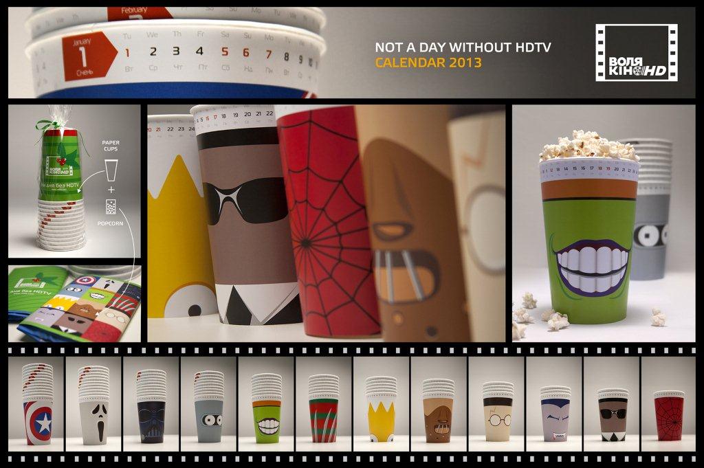 Креативная команда Scholz&Friends Kyiv разработала календарь для партнеров компании ВОЛЯ. Календарь выполнен в виде набора картонных стаканов для попкорна с изображением главных атрибутов героев любимых кинофильмов. Пакет с попкорном шел в наборе.