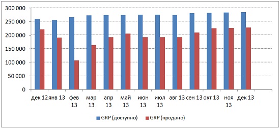 Количество рекламного инвентаря за последний год практически не менялось, как и численность населения страны в целом, поэтому колебания общего уровня украинского GRP незначительные и находятся в пределах 270 тысяч рейтингов в месяц.