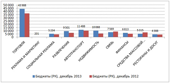Торговля стабильно занимает лидирующие позиции. Из всех рейтингов, доступных на рынке, 13% занимает категория "Реклама и Маркетинг", которая состоит в основном из зафонированных рекламоносителей (довисания не учтены). Категория «Развлечения» активно набирает рекламный вес.