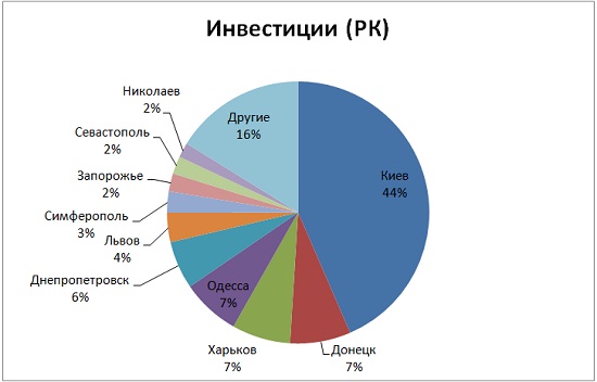 80% всех рейтингов приходится на ТОП10 городов. Киев лидирует с большим отрывом с долей 43% и 44% с долей инвестиций - здесь происходят самые большие битвы рекламодателей за потребителя и самый высокий клаттер. Это неудивительно, ведь по оборотам розничной торговли столица занимает объем в 13% в денежном эквиваленте от оборота всей страны (по данным Госкомстата, январь-ноябрь 2013).
