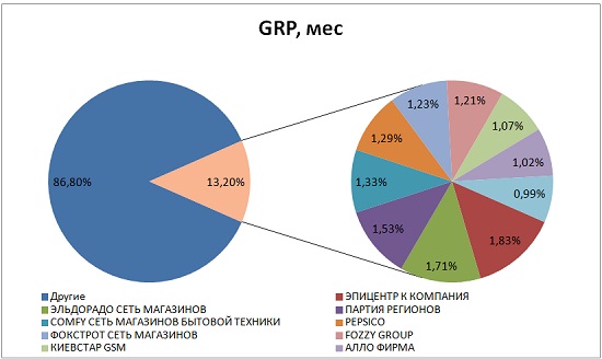 ТОП 10 рекламодателей "откусывают" 13% рыночных рейтингов, остальные 7 722 рекламодателя имеют долю в 90%.