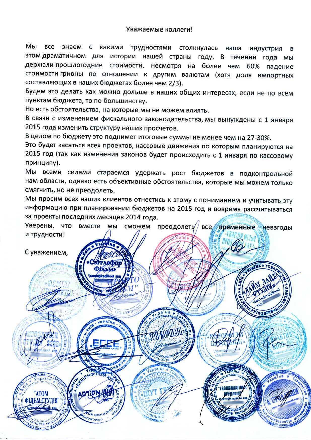 Публикуем открытое письмо продакшен компаний Украины в связи с изменением структуры просчетов бюджетов в 2015 году.