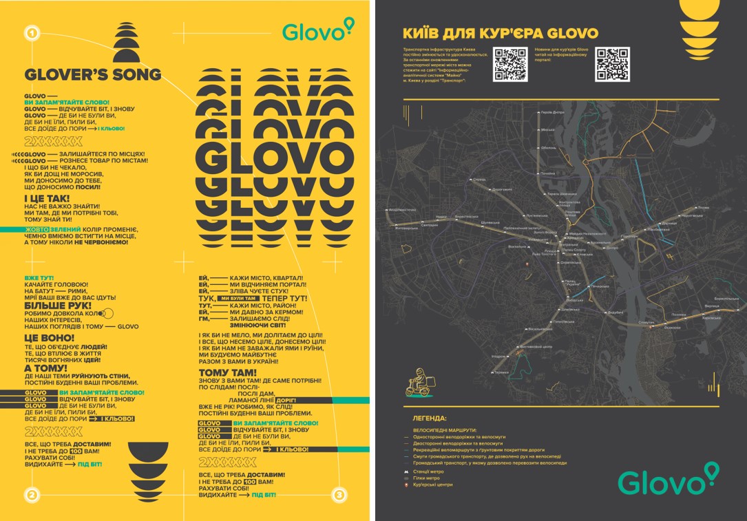 Сервис быстрой курьерской доставки Glovo вместе с агентством Be-it и подключенными к платформе курьерами создали mood-видео на песню «Glovers Song» Артема Лоика. Для монтажа клипа использовали более сотни видео фрагментов от курьеров из разных городов Украины.