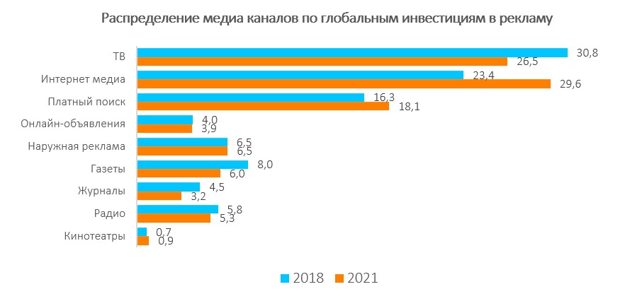 Печатные медиа продолжительное время теряют свою долю, читателей и рекламодателей из-за развития онлайн-платформ. Пик роста печатных медиа припал на 2007 год с отметкой 164 млрд долларов, а в этом году составит всего лишь 70 миллиардов долларов. Теперь и эфирное телевидение начинает падать, но не такими стремительными темпами, как печатные медиа. Zenith прогнозирует уменьшение инвестиций в традиционное ТВ ежегодно с 184 миллиардов долларов США до 180 млрд в 2021 году.