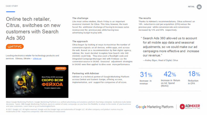 «Search Ads 360 позволил нам учесть все данные о мобильных приложениях и сезонных корректировках, чтобы мы могли сделать наши рекламные кампании более эффективными и увеличить наш доход», -  Андрей Бигун, Head of Digital, Citrus.