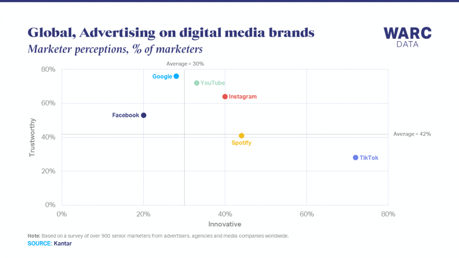 даними опитування понад 900 провідних маркетологів по всьому світу, проведеного компанією Kantar, TikTok вважають найбільш інноваційною, але менш надійною платформою для реклами серед брендів.