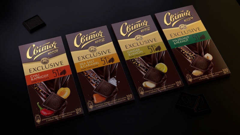 Світоч Exclusive – це вишуканий чорний шоколад зі вмістом какао 51%, представлений чотирма незвичними смаками: чилі з абрикосом, морської солі з карамеллю, імбиру з лимоном, а також лісового горіху з арахісом.